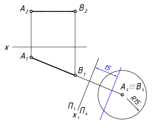 - Для решения задачи введем дополнительную плоскость П4, относительно которой прямая АВ будет занимать проецирующее положение