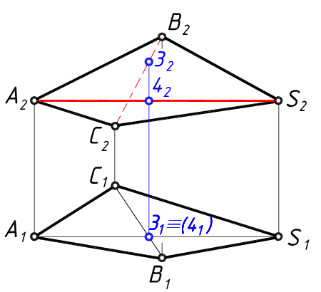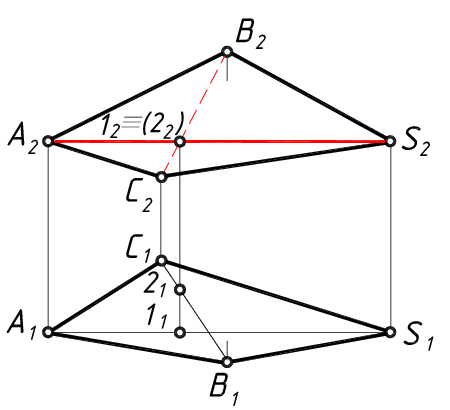 Точка 2 принадлежит ребру ВС, поэтому проекция ребра В2С2 будет невидимой и проводится штриховой линией. Наоборот, проекция ребра А2S2 будет видимой и проводится сплошной толстой линией
