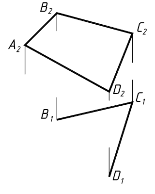 Четырехугольник является плоской фигурой. Для построения его горизонтальной проекции необходимо использовать признаки принадлежности прямой и точки плоскости