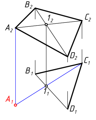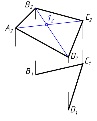 Через точку 1 проведем вторую диагональ горизонтальной проекции четырехугольника. Конец диагонали СА определяется по линии связи с П2