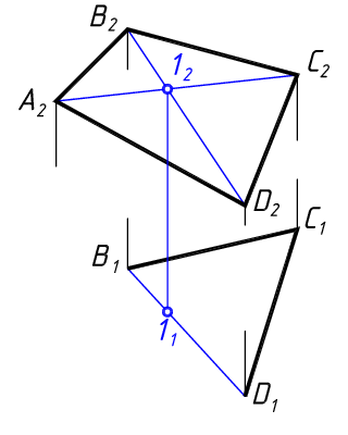 Проведем на фронтальной проекции четырехугольника диагонали и определим их точку пересечения 1