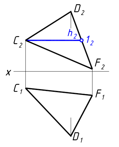 - Построение горизонтали начнем с П2, т.к.  h2 расположена параллельно оси x. Второй точкой, определяющей принадлежность горизонтали заданной плоскости, будет точка 1, лежащая на прямой DF