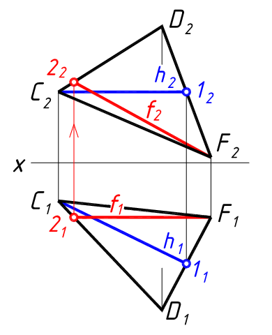 - Построение фронтали начнем с П1, т.к.  f1 расположена параллельно оси x. Второй точкой, определяющей принадлежность фронтали заданной плоскости, будет точка 2, лежащая на прямой CD