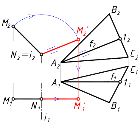Повернем проекцию М2N2 до положения, когда она становится параллельной f2. Длину горизонтальной проекции МN определяем по линии связи с П2