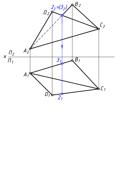Введем дополнительную плоскость проекций П4 так, чтобы ребро угла АС имело на ней натуральную величину. Новая ось х1 располагается параллельно А1С1, линии связи перпендикулярны х1, а координатные отрезки на П4 равны z-координатам соответствующих проекций точек на П2. По конкурирующим точкам определим видимость проекции на П4