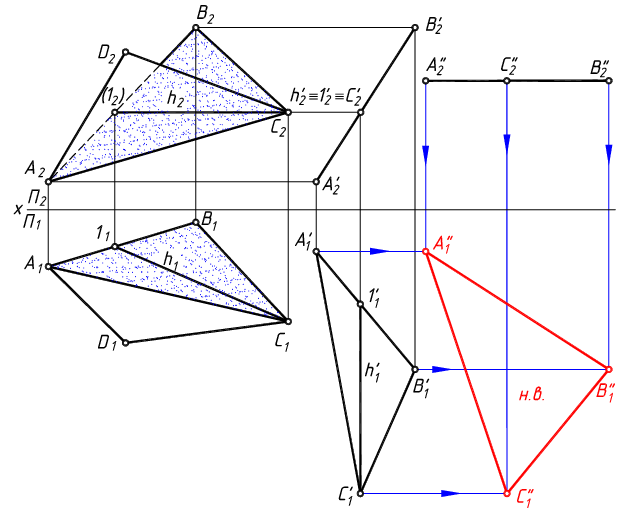 Горизонтальные проекции точек плоскости переместятся по горизонтальным прямым до линий связи с П2. На П1 получаем натуральную величину треугольника