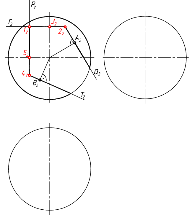 На плоскостях проекций П1 и П3 ветви выреза от плоскостей Q и Т будут проецироваться в виде частей эллипсов. Точки А и В являются концами осей этих эллипсов